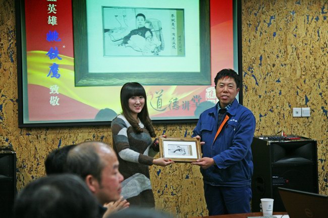 在學模范環節,我們的“身邊人”—來自公司系統中環水務有限公司的蚌埠助人為樂好人姚鐵鷹,講述他十年義務獻血2萬5千毫升的感人事跡。在活動現場,公司向姚鐵鷹贈送了由志愿者們制作的記錄他獻血義舉時的肖像,并向全體職工倡議:向蚌埠好人姚鐵鷹學習,將志愿服務化作自覺行為和生活方式。
