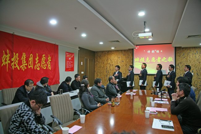 在談感悟環節,主持人介紹了近期公司志愿者注冊登記工作開展情況,宣布成立蚌投集團志愿服務隊。在本環節中, 6名志愿者現場為大家帶來了詩歌朗誦——《蚌投志愿者之歌》并莊嚴宣誓。