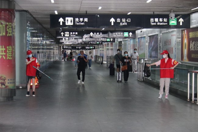 從落客平臺到公交車站再到中央廣場,志愿者們辛苦撿拾每一個煙頭,耐心解答每一次問詢,勸阻亂扔垃圾、隨地吐痰等不文明行為,為創城工作做出了自己的貢獻。