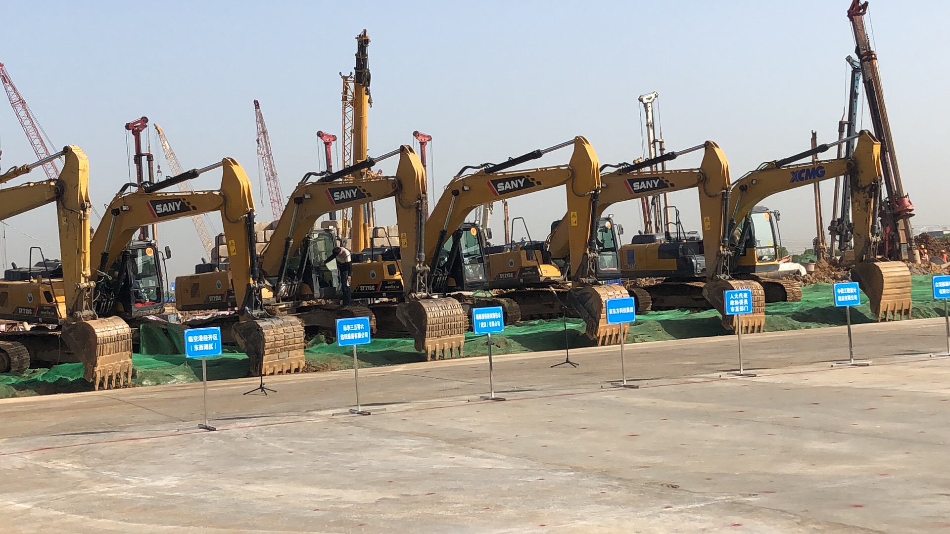 在開工儀式現場,多臺三一中大型挖掘機設備一字排開,霸氣十足,彰顯民族魅力!