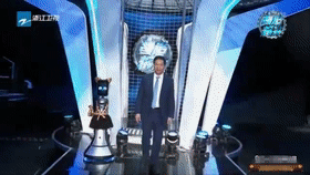 接過鮮花,美女笑得花枝亂顫。主持人蔣昌建也感嘆“機器比人情商高。”